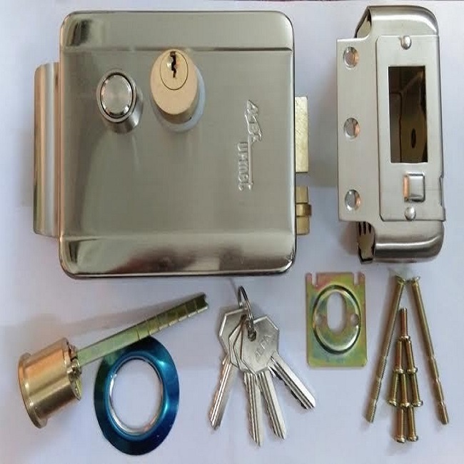 Description: Dual cylinder electronic lock with 3 keys, stainless steel finish for inside opening door Item code: AUHEL2020IN Brand: Alba urmet